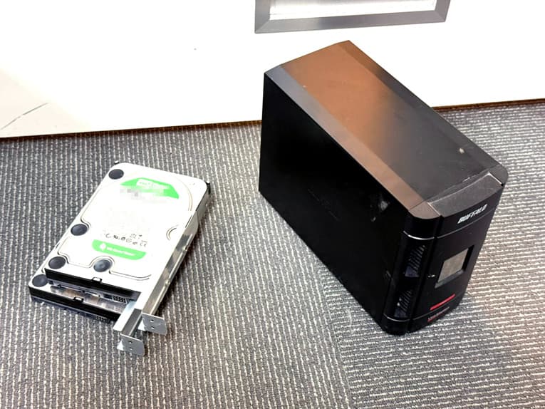 TeraStationやLinkStationにE05エラーが出てHDDが物理的に故障していると判断した場合でも、システムの停止中にHDDを無計画に取り外すのは危険な行為となります。TeraStationやLinkStationでは複数のディスクを使ってRAIDを構築していることが大半で、HDDを抜き差しするとRAIDアレイが再構築を開始し、不完全な状態でデータが保存される、意図しない形で上書きされることもありえます。また、HDDスロットや接続部に過度な物理的負荷がかかると、他の正常なディスクにも影響を与える事も多いものです。