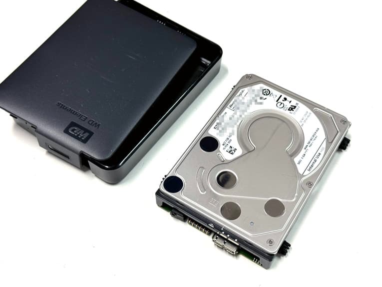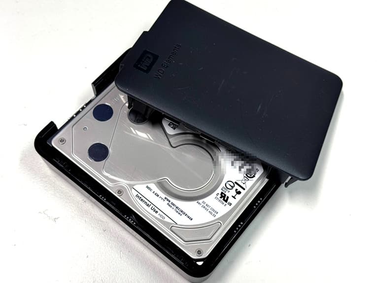 WD Elements などのHDDは精密機器であり、衝撃や落下や水没によって内部の磁気ヘッドやプラッタが損傷すると、正常に動作しなくなる・認識できなくなることがあります。特に「カチカチ」「カタカタ」「ジー」などの異音がする場合には、内部のヘッドが本来、触れるはずのないプラッタに接触してデータを削り取っている音であることが多く、注意が必要となります。