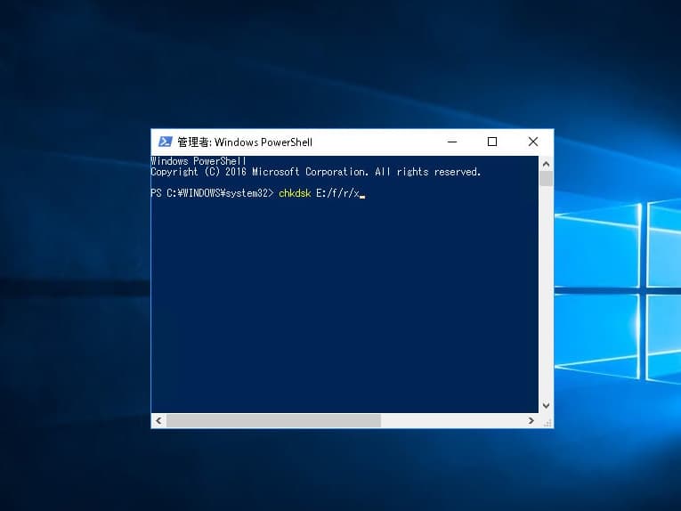 - コマンドプロンプトにコマンド、「chkdsk X: /f /r」を入力する。