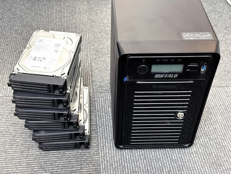 TeraStationは複数のディスクを使ってRAIDシステムを構築します。RAID0・RAID1・RAID5・RAID6などに対応しており、RAID0以外は機器の動作中に1台のディスクが故障してしまったとしても運用が可能・データを保全できることが見込めるものです。