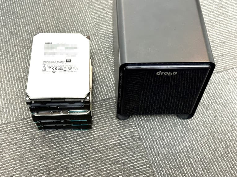 Droboが認識しない・NASにアクセスができない等の不具合が発生した際に内蔵ディスクを筐体から取り出して直接、パソコンに接続することは避けた方が良いものです。Droboに搭載されているディスクはBeyondRAIDを構築しており、ファイル形式やシステムが特殊であることから外付けハードディスクのように単体でパソコンに接続してもファイルやフォルダを見ることはできない・単体での使用はできない仕様となっています。また、認識ができないDrobo内のデータを見ることができないだけではなく、内蔵ディスクを単体でパソコンに繋ぐ行為自体がデータを消失させる行為にもなりかねないため、行わない様に注意しましょう。